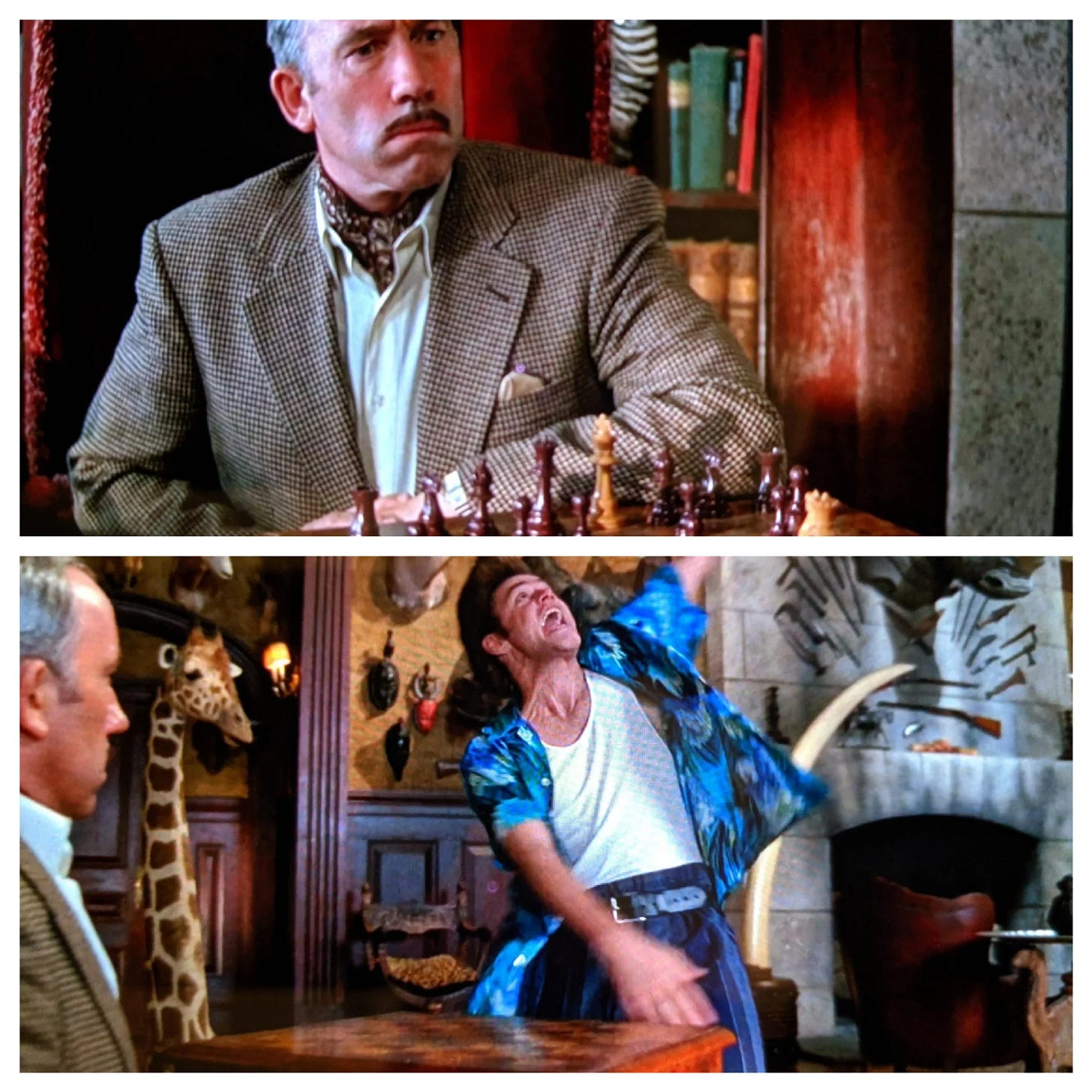 Take the scene in Ace Ventura. We can take in the scene with the chess board, Jim Carrey, and Vincent Cadby. Several shots include the chess board filled with pieces. …