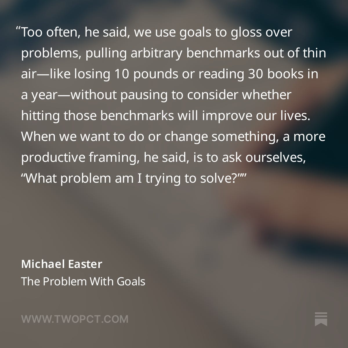 For all this talk about New Year’s resolutions and setting goals, perhaps your best option is to do neither. Your chosen goal might not end up solving your problem. Focusing on your goal might blind you from other actions that will help you solve your problem. Solving a personal problem is more motivating than striving for an arbitrary goal. The “why’ of what we do helps us stay motivated.